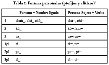 El sujeto es un índice proclítico. Se diferencia del paradigma prefijal de poseedores por comportamientos morfofonológicos. El objeto se integra también en forma indicial ("objeto interno" para la tercera persona, según denominación propuesta inicialmente por Anderson, 1959). Un argumento (actante único de intransitivo o agente de transitivo) es proclítico del verbo. El argumento 2 puede ser también un índice clítico del verbo (en el caso de la tercera persona), y también se expresa con un sintagma nominal con marcas casuales o con un prefijo personal con formas casuales, ambos preverbales. Una vez que haya índice de objeto, el sintagma nominal correferente es un adjunto, tan opcional como lo es el sintagma nominal sujeto.