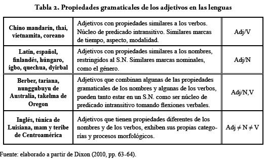 Dixon (2010, p. 63) plantea varias situaciones posibles: los "adjetivos" pueden estar del lado de los verbos (este sería fundamentalmente el caso del tikuna), o del lado de los nombres, o algunos cerca de los nombres y otros cerca de los verbos, o pueden ser diferentes de nombres y verbos. Resumimos ejemplos de Dixon al respecto en la Tabla 2 (la traducción del inglés es nuestra):