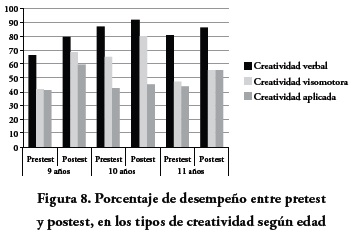 Si se examinan los datos obtenidos según la edad de los participantes, se encuentra una mejoría en la creatividad verbal del 12.5%, del 27.8% en la creatividad visomotora y en la creatividad aplicada del 18.23%, en los niños y niñas de 9 años, de acuerdo con la Figura 8. Se observa también que los niños de 10 años aumentaron la creatividad verbal en un 5%, la creatividad visomotora en un 15% y la aplicada en un 2.5%. Los niños de 11 años tuvieron un aumento en la verbal del 5.56%, en la visomotora del 8.33% y en la creatividad aplicada de 11.81%.
