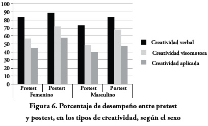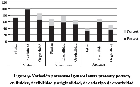Al comparar el desempeño general entre pretest y postest, en los tipos de creatividad9 (Figura 5), se encontró que la creatividad visomotora presentó el mayor incremento, con un 17.36%; le siguió la creatividad aplicada con el 10.06%; y la que menos aumentó fue la verbal, con un 7.63%.