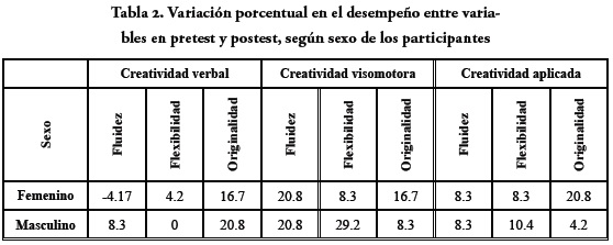 Si se compara el desempeño entre variables (fluidez, flexibilidad y originalidad) entre pretest y postest, de acuerdo con el sexo (Tabla 2), se encuentra que las niñas presentaron un mayor aumento en la fluidez de la creatividad visomotora (20.83%). A este resultado le sigue el de la originalidad verbal con 16.7% y una disminución en la fluidez de este mismo apartado, de un 4.17%. El mayor aumento de los niños fue en la flexibilidad del apartado visomotor, con un 29.2%, a lo que le sigue la originalidad de la creatividad verbal y la fluidez de la creatividad visomotora, con 20.8%.