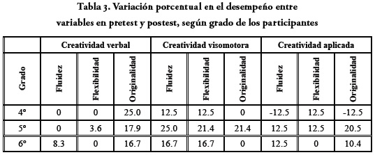 Al estudiar los datos obtenidos de acuerdo con el grado (Tabla 3), se halló que en 4°11 el mayor incremento se presentó en la fluidez y flexibilidad de la creatividad visomotora (12.5%) y en la flexibilidad de la creatividad aplicada (12.5%); mientras que en el grado 5° el mayor aumento se presentó en la flexibilidad y originalidad visomotora con 21.4%, aunque la fluidez verbal no presentó incremento. En el grado 6° se presentó un aumento del 16.7% en la originalidad de la creatividad verbal y en la fluidez y flexibilidad de la creatividad visomotora.