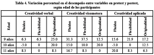 Por otra parte, según la edad, los niños de 9 años mostraron un mayor aumento en la fluidez (31.25%) y en la flexibilidad (37.5%) de la creatividad visomotora (Tabla 4). Los de 10 años tuvieron un aumento del 20% en la variable originalidad de los apartados de creatividad verbal y visomotora, aunque exhibieron una disminución en la fluidez de la creatividad verbal, correspondiente al 5%. Los niños de 11 años presentaron un aumento del 20.83% en la fluidez de la creatividad aplicada, mientras que la originalidad de la creatividad visomotora y la flexibilidad de la creatividad verbal se mantuvieron iguales entre pretest y postest.