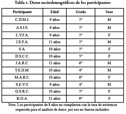 Los sujetos incluidos en este estudio fueron 30 niños (16 niños, y 14 niñas, lo que equivale a un 53.33% de niños y 46.67% de niñas) entre los 8 y los 11 años de edad (2 de ellos tenían 8 años, 6.67%; 7 tenían 9 años, 23.33%; 11 tenían 10 años, 36.67%; y 10 tenían 11 años, 33.33%), de los cursos 4° (4 estudiantes, 13.33%), 5º de primaria (14 estudiantes, 46.67%) y 6 de bachillerato (12 estudiantes, 40%). Los niños y niñas pertenecían al Instituto Comercial Loreto, Sede Boitá, y fueron seleccionados de manera no probabilística, por los directores de grado, debido a su rendimiento académico y comportamental medio-alto.