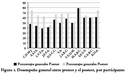 De acuerdo con la Figura 1, al comparar el desempeño general de los participantes entre el pretest y el postest, en general, se observó un aumento en el desempeño de todos los individuos en el postest, con excepción del individuo T.E.D.M. El promedio general de este incremento, equivalió al 11.3%, con una varianza de 87.96%, y una desviación estándar de 7.78%.