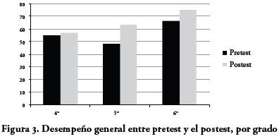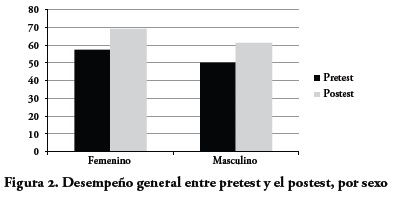 Las niñas presentaron un incremento en su desempeño entre el pretest y el postest, de un 11.4%; mientras que los niños, un incremento de 11.1% (Figura 2).