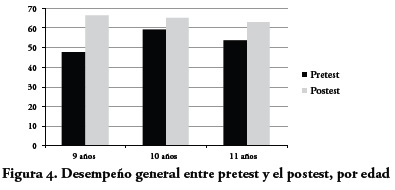 La Figura 4 evidencia que los niños de 9 años tuvieron el mayor incremento general entre el pretest y el postest: fue de 19.01%. En segundo lugar, se puede situar el desempeño de los niños de 11 años (9.4%) y, en tercer lugar, el de los niños de 10 años (6.2%).