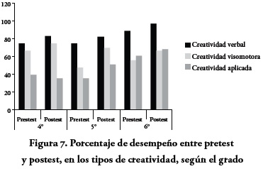 Por otra parte, como lo demuestra la Figura 7, de acuerdo con el grado cursado, se halló que 4º tuvo un aumento del 8.33%, tanto en creatividad verbal como en creatividad visomotora, aunque mostró una disminución en la creatividad aplicada del 4.16%. Por su parte, el grado 5º manifestó un aumento del 7.14% en cuanto a creatividad verbal, del 22.61% en la creatividad visomotora y del 15.17% en creatividad aplicada; mientras que el grado 6º tuvo un incremento en la creatividad verbal del 8.33%, del 11.11% en la creatividad visomotora y del 7.63% en la creatividad aplicada.
