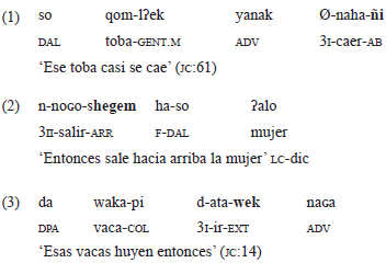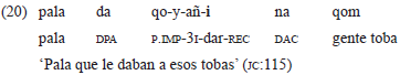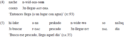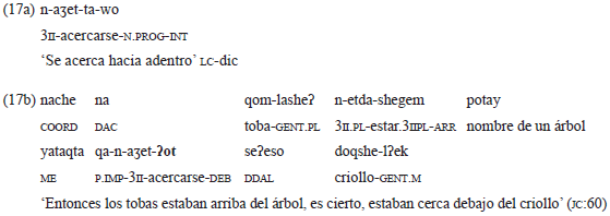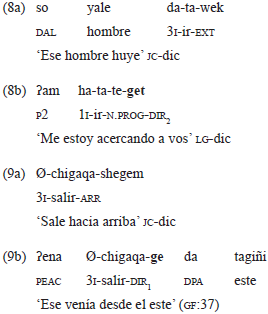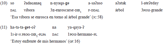 De acuerdo con lo propuesto en González (2009), que también se verifica en el corpus de toba del este, los aplicativos direccionales «-ge» y «-get» pueden promover prototípicamente los roles semánticos de 'meta' (8) y 'fuente' (9).