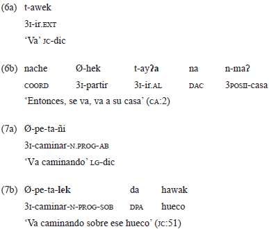 Los aplicativos «-?a» y «-lek» poseen valor semántico alativo 'hacia' y locativo 'sobre' como roles básicos, sobre todo cuando se utilizan con verbos intransitivos (6a)–(7a) que devienen en verbos transitivos (6b)–(7b), por la incorporación de un argumento nuclear en función sintáctica P.