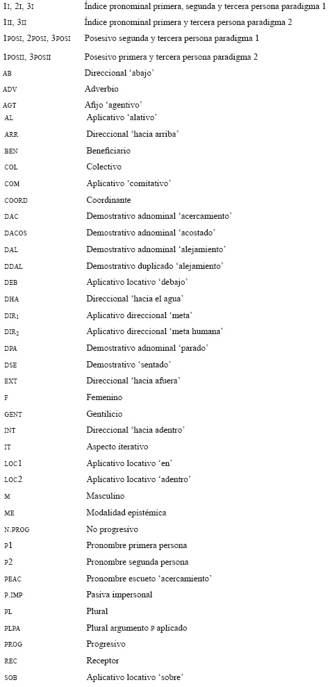 En toba, existen los llamados direccionales (Tabla 1), morfemas que se distinguen del paradigma de los aplicativos ya que, a diferencia de estos, no exigen la presencia de un participante adicional en función sintáctica P y, además, pueden coexistir en el mismo sintagma con los aplicativos (Censabella, 2011, p. 48).