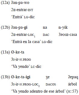 Los aplicativos locativos «-gi» y «-igi», promueven prototípicamente el rol semántico locativo, en bases verbales intransitivas que ocurren en tercera persona con cualquiera de los índices pronominales que codifican a s, como se muestra en (12)–(13).