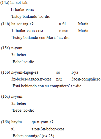 De acuerdo con González (2011, pp. 149-152), el morfema «-e?» promueve a función P un participante comitativo semánticamente periférico que, por la aparición misma del aplicativo en la base verbal, pasa a ser exigido para mantener la gramaticalidad de la cláusula. El aplicativo comitativo puede ser utilizado en tres contextos morfosintácticos: 1) pospuesto al morfema aspectual de progresivo «-tak», al igual que el resto de los aplicativos, pero con una frecuencia mucho mayor (14), 2) pospuesto al morfema iterativo, en combinación con el progresivo «-tapek» (15), y 3) aunque en menor medida, inmediatamente contiguo a la base verbal (16).