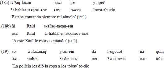 El aplicativo «-em» puede ser utilizado junto a verbos transitivos e intransitivos para codificar un argumento P con rol semántico de beneficiario, como se muestra en (18). En verbos transitivos, es frecuente su uso junto al verbo 'dar', de forma que habilita cláusulas bitransitivas de escasa frecuencia en la lengua, como se observa en (19).