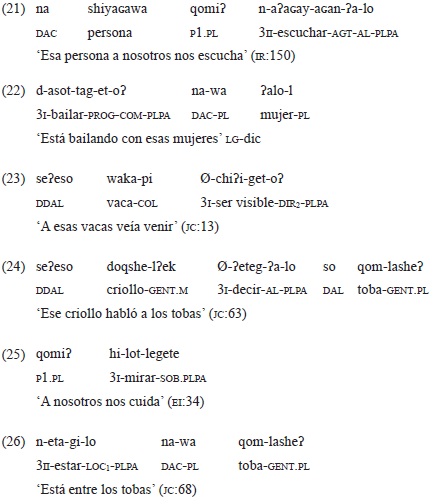 En líneas generales, podemos decir que «-lo» se utiliza para los aplicativos terminados en vocal, «-o» para los que finalizan en consonante (excepto para el caso de la oclusiva velar sorda /k/; por ello, para «-lek», se selecciona «-te»). No registramos en nuestro corpus ejemplos de «-em» con argumentos plurales. Estos índices pronominales se posponen a los aplicativos y se comportan del mismo modo que el afijo «--» en cláusulas transitivas prototípicas, ya que poseen la misma densidad de codificación (solo número), con lo que se distinguen de los índices pronominales que codifican a S y A en los cuales se indexa, además, persona. En el lexema verbal en toba, estos morfemas pronominales ocupan la última posición morfológica, pospuestos a los aplicativos. De (21) a (26), mostramos algunos ejemplos de estos sufijos en cláusulas con aplicativo: