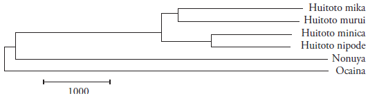 La Figura 2, elaborada a partir del cálculo de similitudes, basado en la comparación de 40 ítems léxicos realizada por el Automated Similarity Judgement Program (Wichmann et al., 2013), representa las distancias entre los cuatro dialectos del uitoto y las lenguas ocaina y nonuya. Esta gráfica muestra que el nonuya y el ocaina tienen una importante distancia genética respecto a los cuatro dialectos del uitoto.