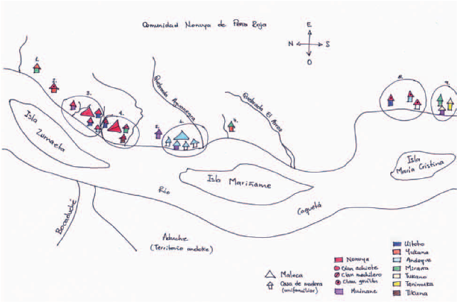 La Figura 1 muestra la distribución espacial y pertenencia étnica de las unidades domésticas en la comunidad nonuya de Peña Roja.