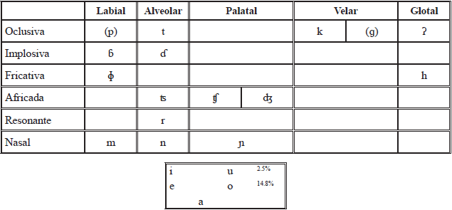 Romero (2013, 2015a) hizo una revisión de la fonología y propuso el siguiente inventario de fonemas, basado en el corpus recolectado del anciano Mamerto Ríos.