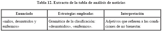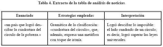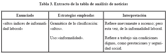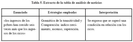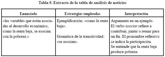 Una vez establecido el marco teórico, se procedió a seleccionar un corpus de estrategias discursivas a analizar y, luego, se crearon tablas (una por artículo) que fueron utilizadas de la siguiente manera: primero, se introdujeron, en la columna izquierda, una serie de enunciados previamente seleccionados. Luego de esto, en la columna central, se escribieron las estrategias identificadas para cada enunciado. Finalmente, en la tercera columna, se introdujo la nueva lectura del enunciado tras el desmonte de la estrategia discursiva. Esta tercera columna es clave, pues no solo contiene el análisis de cada microestructura, sino que además, al ser leída en su totalidad, permite hacerse una idea de la macroestructura del discurso sobre la pobreza. Leer esta sección será como leer un artículo completamente diferente al inicial.