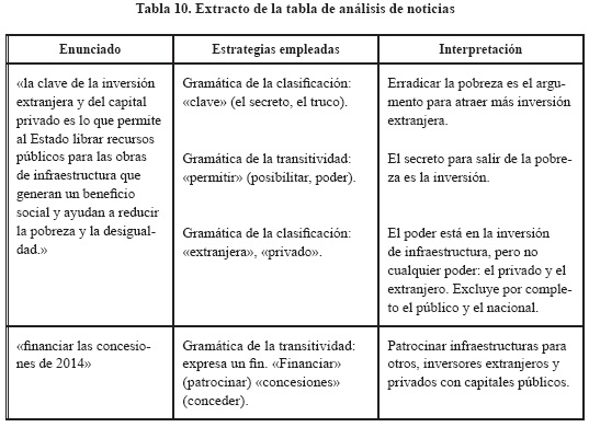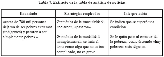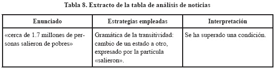 De igual forma, en la estrategia de la clasificación, se están utilizando adjetivos y adverbios que brindan, paradójicamente, una idea positiva de la pobreza: al minimizar sus impactos («pequeño descenso —0.3%—»); al relacionarla con otros factores, como la salud («desnutridos», «enfermos»); al desviar la atención hacia otros factores («extranjera», «privado»); al hacer incluyente un factor: («infraestructura social»); al evitar el lenguaje directo («altos índices de informalidad laboral»). Se observa constantemente el interés por disminuir los impactos de la pobreza, por decir de manera opuesta lo negativo (en vez de desempleo, se usa altos índices de informalidad); y por emplear un lenguaje, a veces, muy elaborado (lo que puede dificultar la comprensión de las implicaciones del término en algunos sectores sociales). Lo anterior se apoya, entre otras, en el uso de verbos que representan acciones respecto a la pobreza y que hemos identificado como gramática de la transitividad. A continuación, se presenta una muestra de análisis de uno de los artículos.