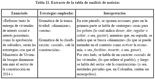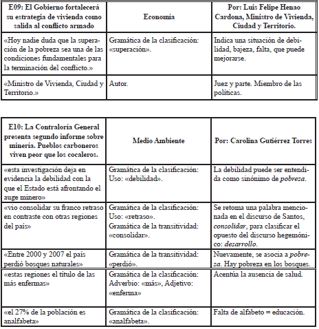 Continúa el texto de Kitzberger (2008, p. 81): «Los medios hablan de pobreza (la mayor parte de las veces) estimulados por actos rutinarios de burocracias públicas y privadas tales como la publicación de informes estadísticos y demosociales por parte de agencias». Y para el caso del corpus analizado, se repiten datos otorgados por el Departamento Administrativo Nacional de Estadística (DANE), una entidad gubernamental. Además, para el caso particular de análisis, se encuentra un artículo escrito por un alto funcionario del gobierno, cabeza de un ministerio, lo cual hace dudar sobre el interés tanto del medio como del gobierno con este texto.