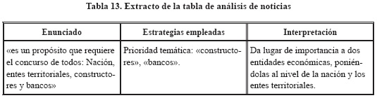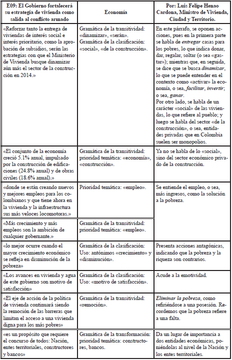 Algo interesante en este apartado es que los constructores y los bancos, dos representantes del capital privado, son puestos al mismo nivel de la nación y los entes territoriales para la solución de los problemas sociales del país. Con esto, se expresa una intrínseca relación y dependencia respecto a estas figuras, que toman protagonismo en el corpus. En el mismo sentido, se evidencia el tema de los términos que se deciden utilizar para representar las problemáticas sociales: por un lado, ocultan información importante para las personas que no tienen conocimientos respecto a un temario; por otro, dirigen el discurso hacia un aspecto determinado.