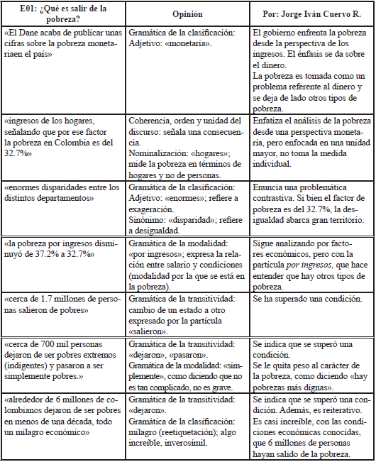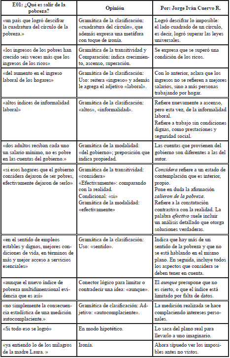 En la primera columna, aparece la expresión «700 mil personas dejaron de ser pobres extremos». El verbo dejaron se encuentra conjugado en tiempo pretérito perfecto simple del indicativo, lo cual indica una acción pasada y finalizada. Como puede leerse en la tercera columna, que corresponde a la de la reescritura, se indica que, al utilizar el verbo dejar en pasado, se está refiriendo también a que se superó la condición de pobreza extrema. Por tanto, esta es una estrategia de negación de la condición que claramente existe en las calles colombianas, como se puede ver en el nuevo Bronx de Bogotá.