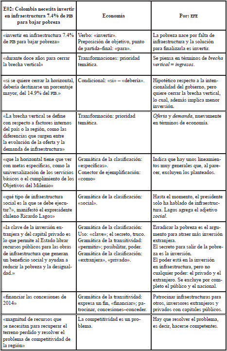 En el primer ejemplo, se emplean los verbos en presente («permite», «generan», «ayudan»), acompañados de los verbos infinitivos («reducir», «librar»). En el segundo ejemplo, que hace parte del mismo artículo, se introduce inmediatamente: «financiar las concesiones de 2014». En este punto, el tema de la pobreza parece ser empleado como argumento para justificar la necesidad de capitales extranjeros que, como los tratados de libre comercio (TLC), han traído más pobreza para el campo y la industria colombiana. Mientras tanto, en el tiempo futuro se habla de las mejoras que dichas inversiones producirán. Es importante recalcar que la percepción de pobreza manejada es la de Corredor Martínez (2011) y la ONU, desde la perspectiva de la falta de oportunidades. Y el aumento de las oportunidades para los colombianos es algo que se menciona en las notas. Parecen decir que puede que sigan pobres, pero tienen oportunidades. Aun así, no se evidencia ningún esfuerzo por ocultar que dichas oportunidades benefician principalmente a diversos sectores económicos, como mostraremos a continuación.