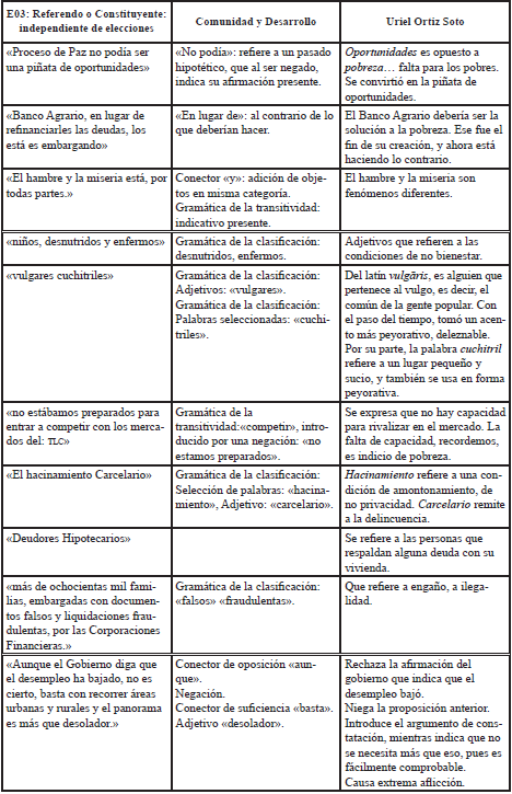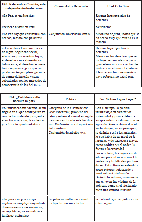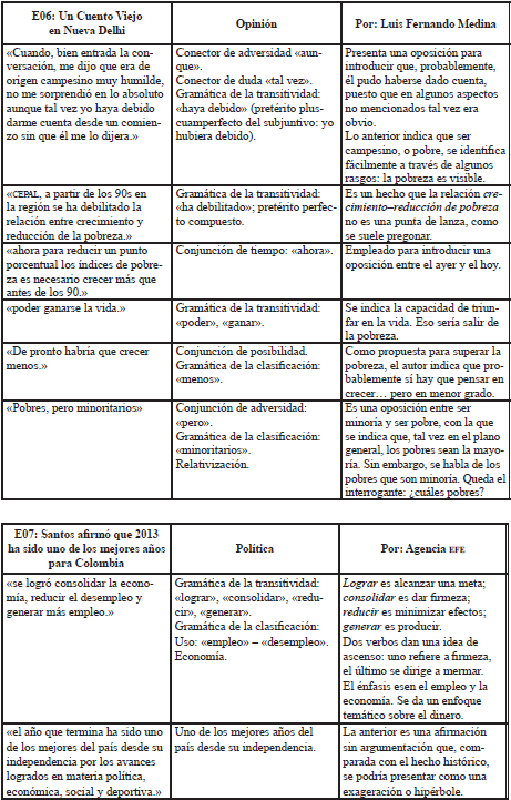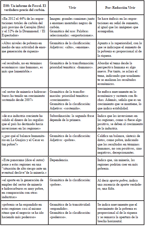 Retomando a Hall (1980), cuando afirmaba que cada significante dado o codificado con sentido debe ser interpretado significativamente o descodificado por el receptor, es importante que los lectores, por un lado, logren identificar estos paradigmas discursivos que se repiten constantemente y que no coinciden con el pensamiento natural de muchos redactores (que, más que responder a la verdad, responden a orientaciones y lenguajes programados). Hay que ser capaz de identificar con ojo crítico los intereses detrás de las estructuras que nos presentan como noticias o como columnas de opinión. Para ello, recomendamos tomar las tablas de análisis presentadas y leer la primera columna correspondiente a cada artículo y pensar en la idea principal. Luego, leer la tercera columna, donde se realiza el análisis, y sacar la idea principal. ¿Es lo que escriben lo que nos quieren decir?