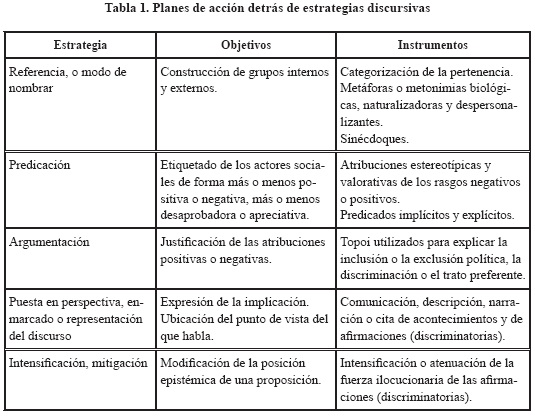 A continuación, en la Tabla 1, se describen los planes de acción que orientan una estrategia discursiva, según Ruth Wodak (2000, citada en Sal Paz & Maldonado, 2009).