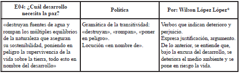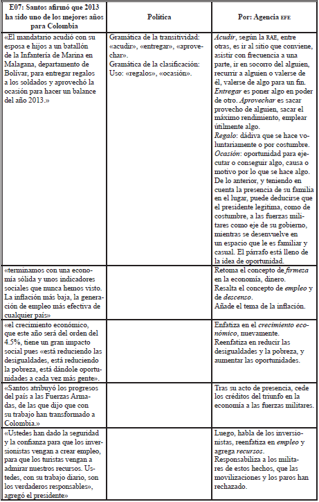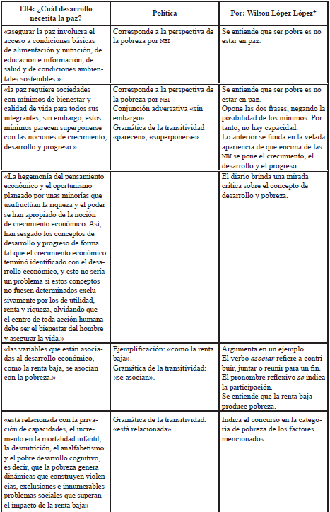 Nuevamente, en la primera columna, se evidencia el uso de un verbo en indicativo presente, «están asociadas» – «se asocian» que, en este caso, sirve para introducir el tema de la renta baja, a partir del término pobreza. De esta manera, se lleva al lector a relacionar el hecho de la pobreza con una falta de desarrollo económico, lo cual no es más que una forma de introducir en el pensamiento la idea de la necesidad de la renta alta. Además, en este mismo orden gramatical, aparece constantemente el uso de verbos en infinitivo, palabras que son utilizadas con el fin de movilizar hacia el apoyo o justificación de la implementación de inversiones extranjeras, y de las concesiones de recursos naturales y territorio nacional, o lo que se conoce como el impulso al desarrollo económico mediante las locomotoras del desarrollo, propuestas por el gobierno de Santos.