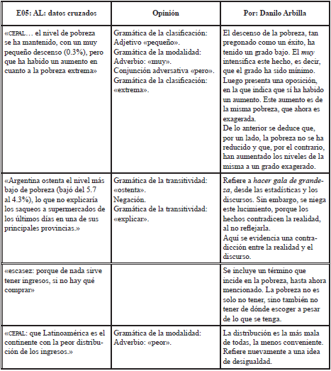 Como se alcanza a percibir, el autor evita decir directamente una de las pocas críticas presentadas en los artículos que conforman el corpus y emplea un tropo para hacer entender que el discurso oficial sobre la pobreza no es lo que aparenta ser.