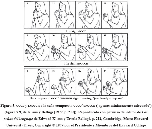 Ellos recogieron y analizaron un gran número de señas compuestas, con lo que demostraron que los compuestos adquieren sus propios significados y que sus formas se diferencian de las secuencias simples de dos señas. Por ejemplo, consideremos la seña que significa algo como just barely adequate ('apenas mínimamente adecuado'), formada de GOOD ('bueno') y ENOUGH ('suficiente'), en ese orden. La Figura 5 repite las ilustraciones de Bellugi y Klima sobre la manera en la cual un individuo zurdo señó GOOD y ENOUGH, y cómo esa misma persona hizo la seña del compuesto GOOD^ENOUGH just barely adequate ('apenas mínimamente adecuado').
