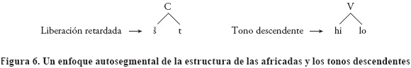 Sin presentar una contrapropuesta explícita, Hayes (1993) sostiene que en el análisis de las lenguas habladas los fonólogos se han ido alejando de los rasgos dinámicos. Antes de la aparición de la fonología autosegmental, la africada era considerada como una consonante única que incluía más de una sola configuración. Su configuración inicial, representada en la Figura 6 se parece a [t], y su configuración final se asemeja a [š]. Dadas estas correspondencias, los fonólogos llegaron a representar la africada como una secuencia unida de dos configuraciones estáticas distintas, y no como una sola consonante con el rasgo dinámico [+ liberación retardada].