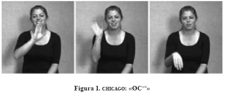 Stokoe analizó CHICAGO («ØC>V») como si tuviese una secuencia de dos movimientos: «>» (hacia la derecha) y «V» (hacia abajo). En la propuesta de Liddell (1984) CHICAGO consta de una secuencia de tres segmentos: mmh. La mano se mueve hacia la derecha durante el primer movimiento, hacia abajo durante el segundo, y finalmente termina con una detención11.