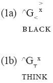 Hay otro aspecto significativo de la representación de los símbolos dez que necesita ser mencionado aquí. Los diecinueve símbolos que constituyen el sistema dez son presentados sin ninguna referencia a cómo están orientadas las manos. En la práctica real, Stokoe frecuentemente añade subíndices u otro tipo de diacríticos que describen ciertos detalles perceptibles de orientación manual. Esto es evidente en la comparación de las transcripciones de Stokoe para BLACK ('negro') y THINK ('pensar'), ilustradas en el ejemplo 1 (Stokoe, Casterline, & Croneberg, 1965, pp. 126, 128). BLACK (1a) se inicia con la punta del dedo orientada a la izquierda («G<»), mientras que para THINK (1b), está orientada hacia el señante («Gt»)6.