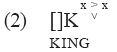 Stokoe también representa algunas de las señas sin cambios de configuración manual, con movimientos simultáneos entre otros movimientos secuenciales, como en king ('rey'), que se muestra en el ejemplo 2. La seña es producida por un primer contacto («x») en el lado superior izquierdo del torso, con el lado radial de la configuración manual de K. Luego la mano se mueve hacia abajo («˅») y simultáneamente a la derecha («>»), seguido de otro contacto («x») en el lado inferior derecho del torso.