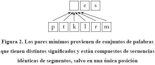 El concepto de pares mínimos es utilizado frecuentemente para asignar fonos a categorías fonémicas distintas. Los pares mínimos son pares de palabras que comparten fonos idénticos en todas las posiciones secuenciales, excepto en una. El conjunto de palabras que incluye [tes] tez, [pes] pez, [kes] ques, [les] les, [mes] mes y [res] res, pueden ser emparejadas entre sí, una con otra, para demostrar la noción de par mínimo, como se ve en la Figura 2. El hecho de que [pes] pez y [res] res sean palabras distintas con significados diferentes demuestra el potencial contrastivo de los segmentos fonéticos [p] y [t], que están situados en diferentes categorías fonémicas, en virtud del hecho de que ocurren en secuencias dentro de palabras con diferente significado, que de otra manera serían idénticas.