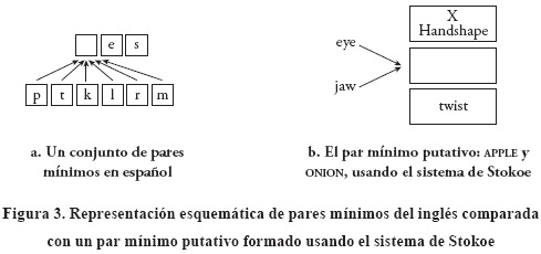 La Figura 3 ilustra las diferencias geométricas esquemáticas entre pares mínimos en el habla y un par mínimo putativo de señas. Los pares mínimos en el habla se descubren cuando las secuencias de fonos difieren por un solo elemento secuencial, como en la Figura 3a. Por lo tanto, [pes] pez y [tes] tez constituyen pares mínimos en español. En la Figura 3b, donde el concepto se aplica a APPLE y ONION, el concepto de secuencialidad se omite, debido al supuesto de simultaneidad del sistema de representación de Stokoe. El análisis simplemente aplica el concepto de sustituibilidad de manera simultánea sobre los tres queremas. Dado que las dos señas difieren solo en la localización (mejilla y lado del ojo), son utilizadas para afirmar que constituyen un par mínimo. El problema aquí es que la sustituibilidad (la oposición paradigmática de Saussure) no es suficiente para demostrar el contraste (el contraste sintagmático de Saussure).