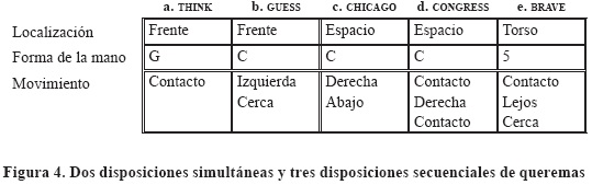 Repasemos la propuesta de Stokoe en cuanto que un haz simultáneo de queremas se adhiere al significado como una sola unidad. Stokoe representa algunas señas como constituidas por tres queremas simultáneos. Este hecho es representado en la Figura 4 como grupos de rasgos organizados verticalmente. Esto se encuentra en consonancia con la práctica común de representar fenómenos simultáneos dentro de un evento lingüístico. Por ejemplo, THINK ('pensar') (Figura 4a) es representado con los siguientes tres queremas simultáneos: frente, forma de la mano en G, y movimiento de contacto.