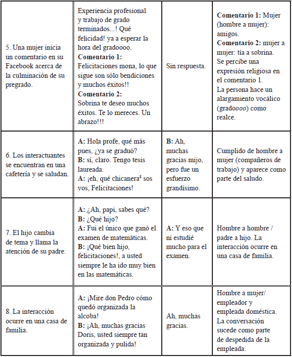 En relación con las respuestas, el receptor del cumplido en ocasiones agradece y hace un comentario («Ah, muchas gracias mijo, pero fue un esfuerzo grandísimo»), pone a disposición aquello por lo que lo elogian («ahí lo tiene a la orden»), no brinda una respuesta esperada y utiliza una expresión que implica una autovaloración («y eso que ni estudié mucho para el examen») o no brinda respuesta alguna. Es importante anotar que en estos dos últimos casos la imagen de los interlocutores no corre peligro alguno, debido, por un lado, a que en la autocortesía los interlocutores le dan importancia a su propia imagen positiva y a la del otro (Zuluaga & Echeverry, 2012); por otro lado, no responder es una categoría válida como estrategia en las interacciones (Chen & Yang, 2010; Siebold, 2008; Lopera, 2015). Finalmente, los cumplidos aparecen en diferentes momentos de la interacción (al inicio, en la mitad, al final) y tanto hombres como mujeres producen los cumplidos (hombre a mujer, hombre a hombre, mujer a mujer, mujer a hombre).
