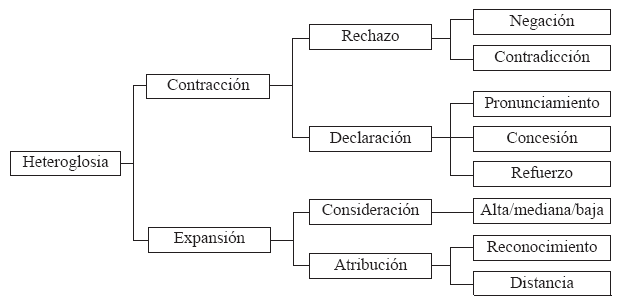 La heteroglosia agrupa los enunciados que dan participación a otras voces dentro del texto, lo que permite alternativas dialógicas en un continuo de opciones que abarca distintos grados de imparcialidad y reconocimiento (Martin & White, 2005). A medida que las escogencias avanzan hacia el extremo de la tipología se hacen más negociables o debatibles y el autor se presenta menos comprometido con su contenido. La hetero-glosia incluye el posicionamiento intersubjetivo logrado mediante la presentación de la propia voz autorial (intravocalización) o mediante la integración explícita de otras voces (extravocalización), opciones que se clasifican dentro de la expansión y la contracción dialógica (ver Figura 1).