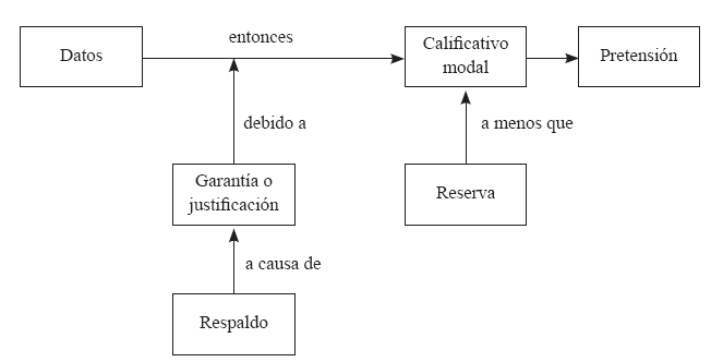 Méndez alude aquí a la estructura argumental del entimema aristotélico. En la línea epistémica de Harada (2009), planteamos que el modelo de argumentación propuesto por el filósofo británico Stephen Toulmin es una herramienta útil para examinar las premisas implícitas u omitidas en los entimemas, ya que pretende, justamente, explicar cómo se consigue la aceptación de una aseveración o pretensión en el contexto de los argumentos dialógicos.