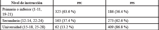 Además del análisis cualitativo, nos propusimos analizar si, al igual que en otros cambios observados en el español andino -como el sistema pronominal átono de tercera persona, véase García Tesoro & Fernández Mallat (2015)-, hay factores sociales que influyen en el cambio. Efectivamente, en la sociedad peruana el nivel de instrucción (que va íntimamente unido al nivel socioeconómico y a ocupaciones más o menos cualificadas en función del acceso a estudios superiores) se revela fundamental, pues determina en gran medida el acceso a un aprendizaje formal del español y a una mayor conciencia de la norma estándar y de los rasgos distintivos de la variedad andina (que tratan de evitar, pues está fuertemente estigmatizada). En el corpus, igualmente, los hablantes que han aprendido español de manera formal en la escuela y tienen mayor nivel de instrucción, muestran la presión de la norma, pues perciben estos usos del PPC como marcados y tienden a evitarlos. Los datos se muestran en la Tabla 3.