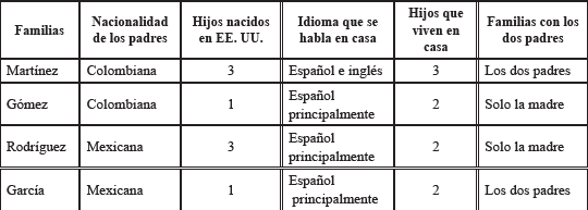 En la siguiente tabla, se muestran algunos datos sobre los participantes (los apellidos de las familias fueron cambiados para efectos de confidencialidad). Como se puede observar, dos de las familias son monoparentales y dos biparentales. Con excepción de una familia, usan principalmente el español en casa. Además, todas las familias tienen, al menos, un hijo nacido en Estados Unidos. Los perfiles de las familias serán descritos en la sección a continuación.