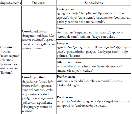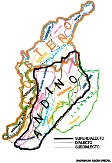 En el territorio colombiano se evidencian estos dos superdialectos (costeño y andino), en los que se pueden identificar otras características lingüísticas adicionales. Los materiales recolectados a partir del Atlas lingüístico-etnográfico de Colombia (ALEO) de Flórez et al. (1981-1983) han facilitado la descripción de las variedades diatópicas del español de Colombia. Esta obra presenta rasgos fonéticos, morfosintácticos y, principalmente, léxicos del español popular de mediados del siglo pasado (Flórez, 1983)8.