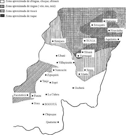 [...] en el muisca o chibcha del altiplano de Bogotá había, fuera de las diferencias mayores o menores a que hacen referencia los cronistas, una partición dialectal entre la zona que tenía como centro a Bogotá, gobernada por el Zipa y la que giraba alrededor de Tunja y el poder del Zaque; la alternancia ch ~ rr sería uno de los rasgos fónicos que determinaban la división.