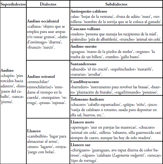 En primer lugar, el influjo del léxico quechua en el subdialecto andino-sureño es evidente. En segundo lugar, los muisquismos se registran notoriamente en el subdialecto cundiboyacense, aunque Mora et al. (2004) no identifican muchos en el ALEO que sean exclusivos de esta variedad. En tercer lugar, los caribismos, según Rodríguez de Montes (2012), se emplean más en el dialecto llanero, pero hacen falta investigaciones al respecto. Por último, los tupí-guaranismos, aunque no existen estudios sobre su uso y distribución en el español colombiano, se concentran aparentemente en la región amazónica.