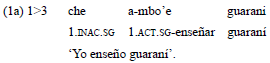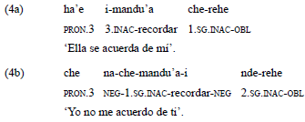 En caso de la raíz «mandu'a», el rol de experimentante se maniiesta siempre en el verbo a través de los preijos inactivos, y es correferenciado en construcciones nominales o mediante pronombres. El rol de estímulo no es expresado a través de una relación gramatical, sino como argumento oblicuo. Esta situación se representa en el ejemplo 4.