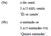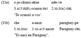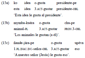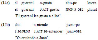 En el ejemplo 14a, el estímulo es indexado en el verbo, a través del prefijo activo «o-», y es correferenciado en una construcción nominal; mientras que el experimentante, que corresponde a una tercera persona, es expresado a través de una construcción oblicua. En el ejemplo 14b, en cambio, el estímulo no es expresado en una función argumental, sino como oblicuo; y el experimentante, como A.